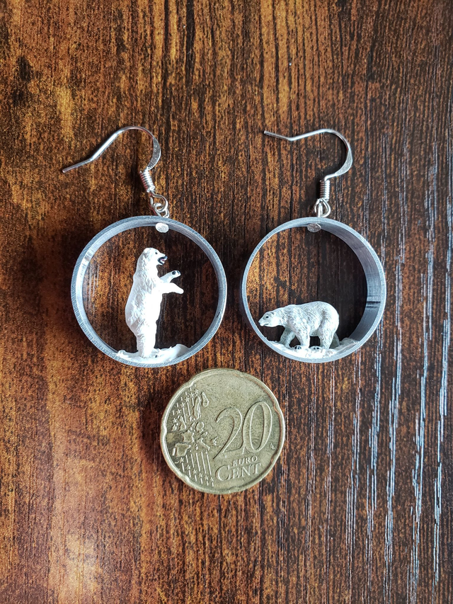 Das Eisbärpärchen ist im Schnee unterwegs und schmückt die Ohren im silbernen runden Rahmen.