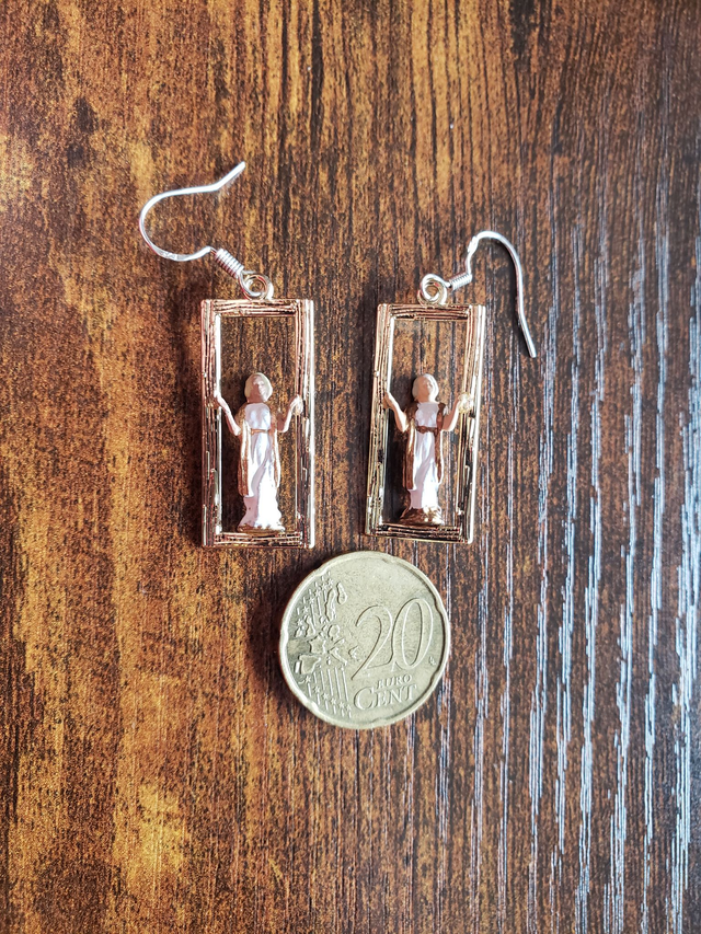 Ein Schutzengel wacht über seinen Träger und schmückt die Ohren im goldenen Rahmen.