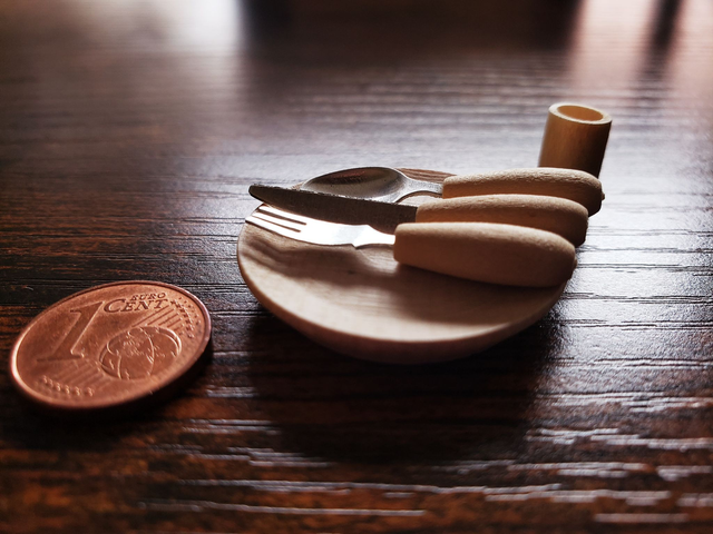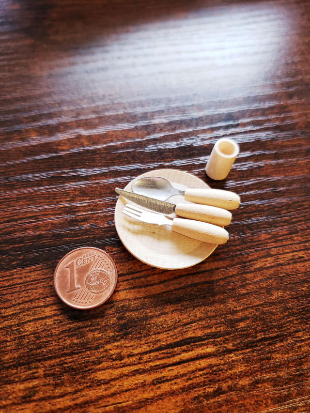 Maße: Teller 3 cm, Bestecklänge max. 3,2 cm, Becherhöhe 1,2 cm