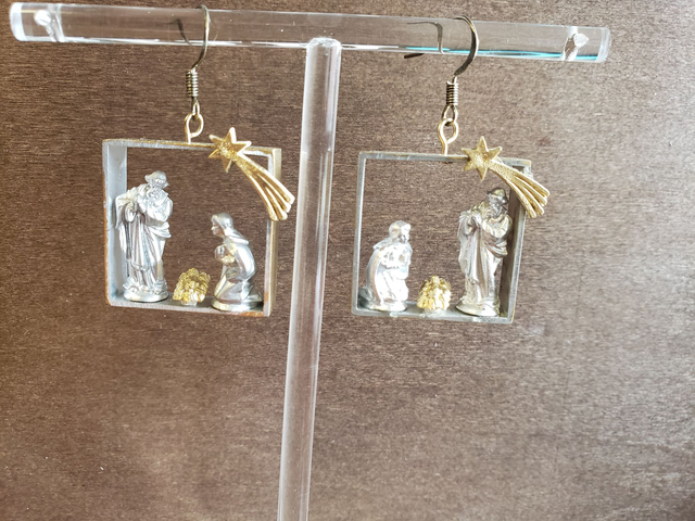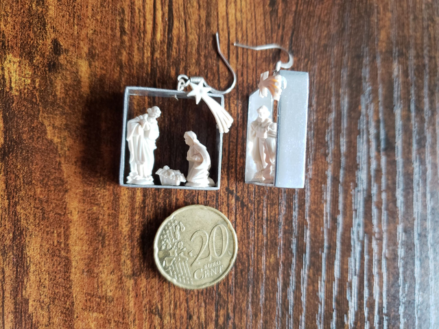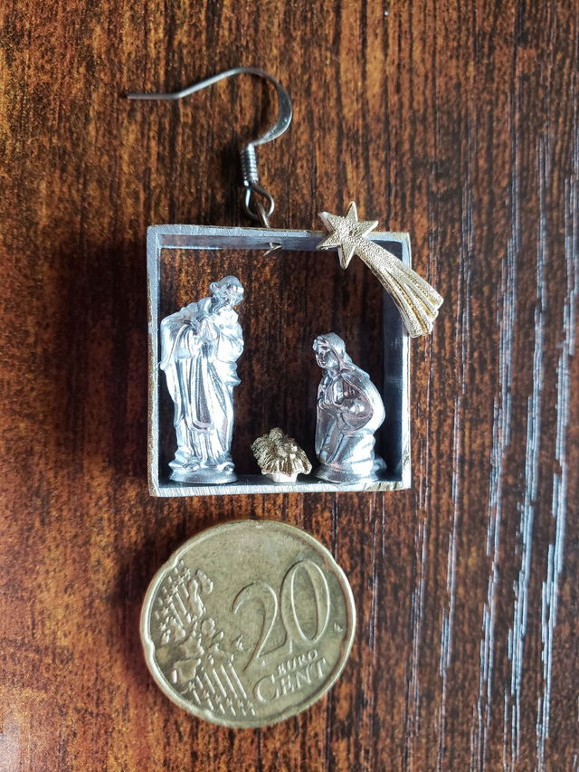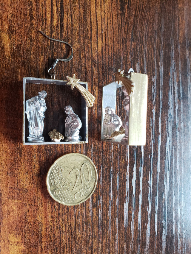 Zur Weihnachtszeit die Krippe immer dabei haben. Schmücken Sie Ihre Ohren festlich mit der einfarbigen heiligen Familie im silbernen Rahmen oder die üppigere Variante in Gold und Silber.