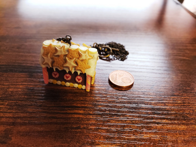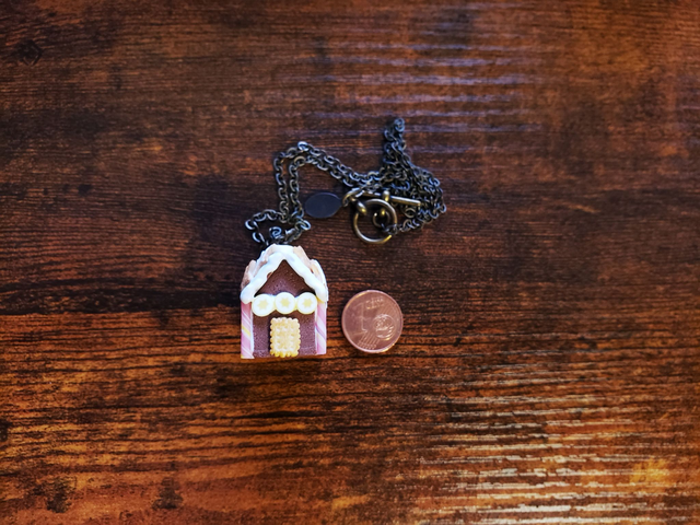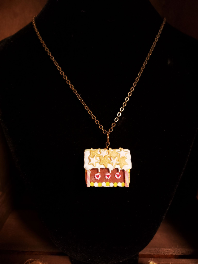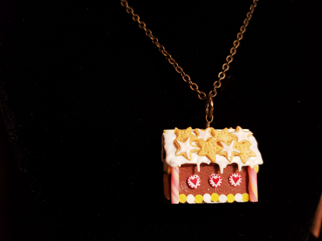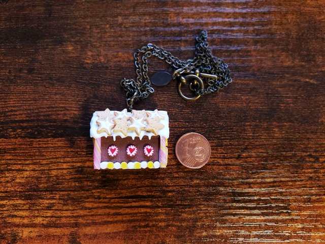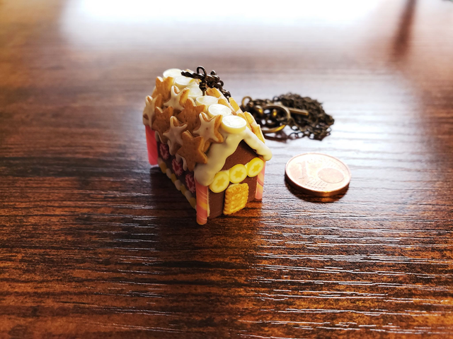 Ein kleines Lebkuchenhaus für den Hals aus Fimo gearbeitet in 3D-Optik. Viele Details zieren das kleine Häuschen - zum Anbeißen!