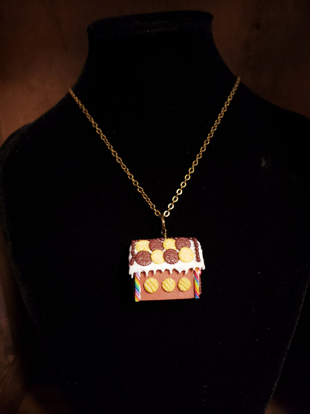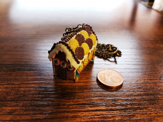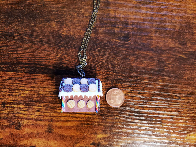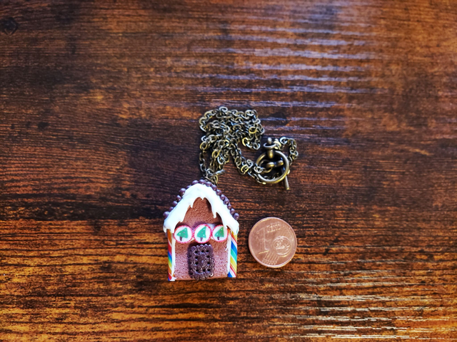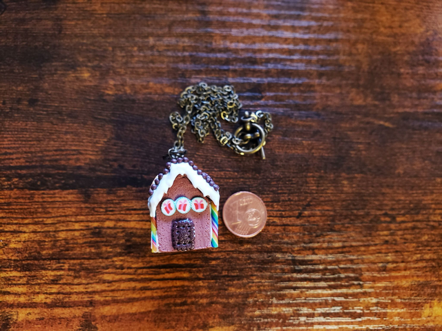 Ein kleines Lebkuchenhaus für den Hals aus Fimo gearbeitet in 3D-Optik. Viele Details zieren das kleine Häuschen - zum Anbeißen!
